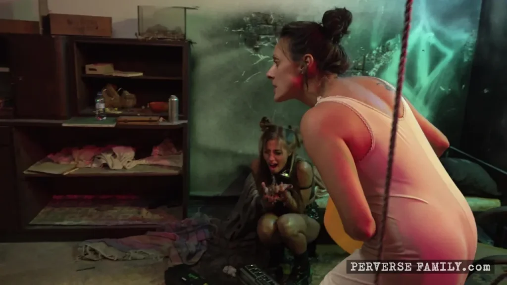 One of the punk twins has short blonde hair, a slim frame, and a visible arm tattoo — she spends most of the scene tied up with rope in a dimly lit basement. The other twin shows up later on a staircase, brunette, long hair, same lean build, also marked with tattoos. They’re both in their early 20s, pale, with that raw underground look — ripped fishnets, smeared lipstick, the whole vibe. The guy’s built like a gym rat, short brown hair, muscular, no restraints on him while he dominates both girls. You see wrist cuffs, close-ups of intimate touching under red lighting, and some rough anal fingering that makes one twin grimace and laugh at the same time. There’s a bathroom scene too — tight close-up on his ass, clear bruising, looks like it’s been worked over already. The energy’s not polished — it’s gritty, spontaneous, with a lot of focus on power play and humiliation. They switch up positions: doggy style, her riding him backwards, one girl face-sitting while he jerks off underneath. Camera work’s messy but effective — medium shots that linger on the details, like how one twin bites her lip when she’s stretched. No soft lighting or fake moans. This is basement-level BDSM with real tension and zero filter.
