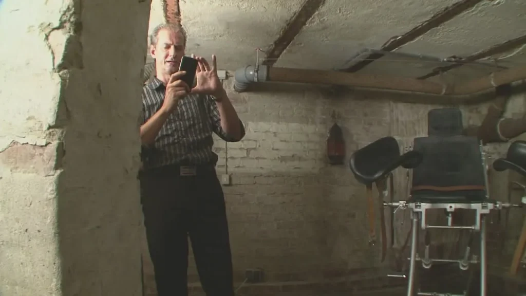The girl’s tied to a beat-up metal chair, wrists cuffed behind her back, dim light cutting across her red hair and the tattoo on her chest and arm. She’s slim, pale, mid-20s, and fully restrained while a stocky older guy with graying short hair and glasses moves around her — not rushing, just doing what he wants. He starts off touching her over clothes, then hands go under, then directly on her pussy, all in slow, deliberate motions. At one point he’s holding a candle close to her leg, lighting up the scene in flickering orange — she flinches a little, but doesn’t break. Later you see him step back, snap a photo with an old-school digital camera, like he’s documenting her like a specimen. Most of it’s shot from low angles, tight close-ups on skin and restraints, then wider when he moves around. The whole vibe’s cold, clinical, like a private session you weren’t meant to see. Nothing’s rushed. No talking. Just control, camera flashes, and her reacting to each touch. The lighting keeps it raw — shadows hide nothing.