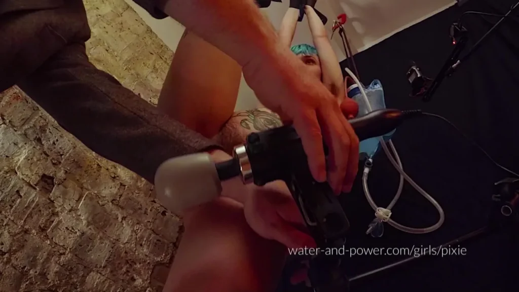 The video starts with a white girl in her 20s with teal hair and short, slim tattoos on her torso and thighs. She’s suspended by straps in an industrial setting with metal beams. A toy is applied to her in a BDSM context. Later, a male and another female join in. The equipment application is a focus, with POV and side views. The girl’s hair and tattoos are notable. The industrial setting provides a unique backdrop.