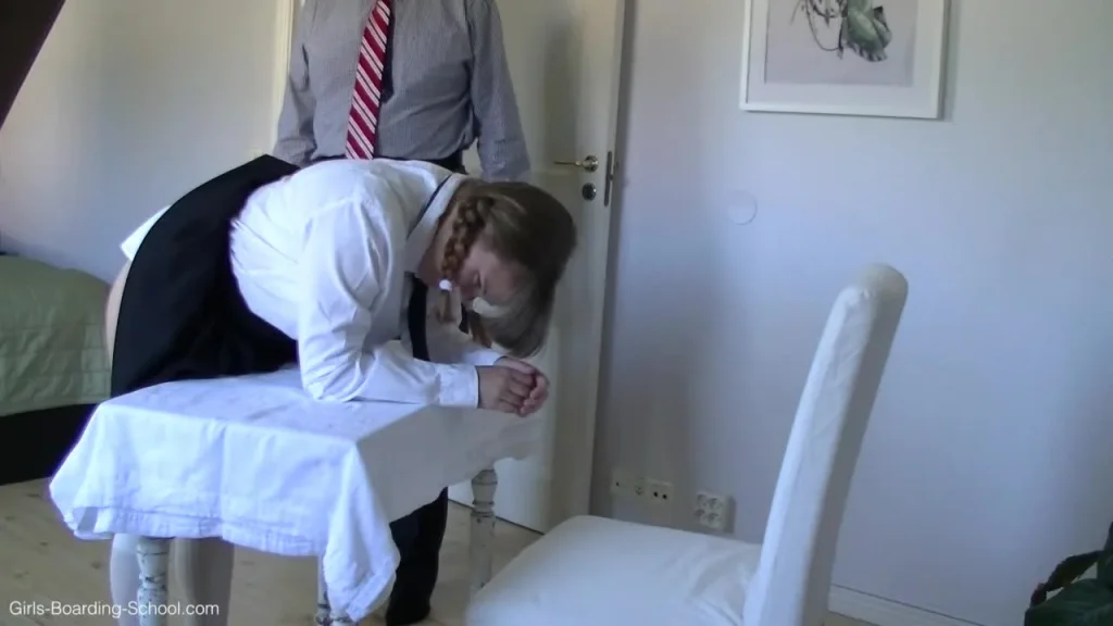 The video shows a blonde teen girl with glasses and a petite build getting intimate with an older man in her bedroom. He’s adjusting her clothing and touching her buttocks under her skirt. She then bends over a table, face down and buttocks up, while he stands behind her. The man spanks her buttocks with a wooden stick. The girl has brown braids and bangs, and there’s a painting on the wall in the background. The camera captures a natural, wide shot of the scene.
